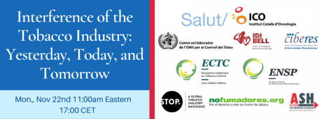 Lunes, 22 de noviembre 2021; 17:00 h. CET El webinar tendrá traducción simultánea en inglés y castellano. Es necesario registrarse en este enlace (o más abajo). Durante mucho tiempo, la industria del tabaco ha estado interfiriendo en las políticas de control del tabaco a nivel local, regional y mundial mediante diversas tácticas. Estas tácticas agresivas intentan socavar los esfuerzos de…